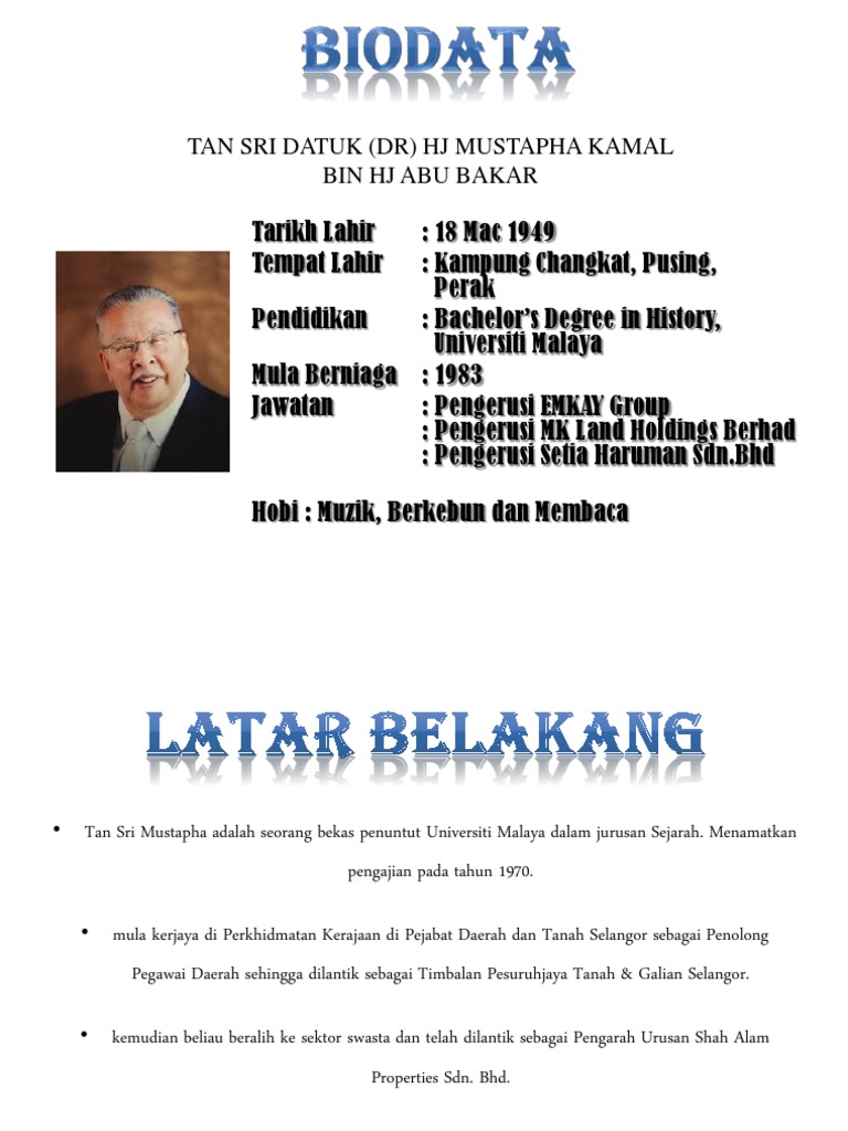 Pengasas syarikat hartanah MK Land itu meninggal dunia di Institut. Tan Sri graduated from University of Malaya. Emkay Group founder Tan Sri Mustapha Kamal dies at 73.